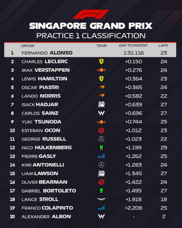 Úvodných 60 tréningových minút na víkendovú Veľkú cenu Singapuru sa stalo korisťou Fernanda Alonsa. Pilot Aston Martinu bol o viac ako desatinu rýchlejší v porovnaní s druhým Charlesom Leclercom, nuž a tretieho Maxa Verstappena zdolal o takmer tri desatiny.
