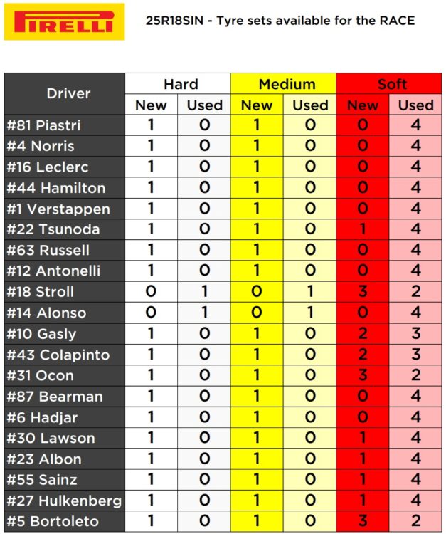 Pirelli dnes predpovedá jednozastávkové preteky. Ani zvýšenie maximálnej rýchlosti v boxoch nestačilo na to, aby bola dvojzastávková taktika atraktívnejšia než stratégia s jedným pitstopom. Na to by singapurský okruh musel ponúknuť lepšie miesta na predbiehanie.