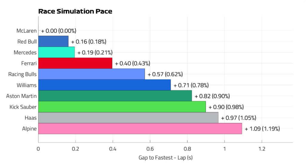 Papierovo by mal mať najrýchlejší monopost McLaren s náskokom necelých dvoch desatín na kolo pred Red Bullom a Mercedesom. Ferrari má výraznú stratu a podľa papierových predpokladov sa do bojov o pódium nezapojí.