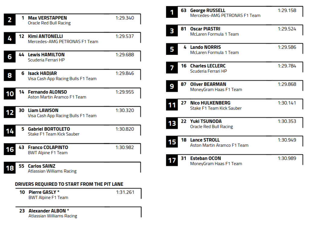Po kvalifikácii sa poradie na rošte upravilo v niekoľkých prípadoch. Obaja piloti Williamsu boli diskvalifikovaní, pretože štrbina v ich zadnom krídle prekročila povolené rozmery. Sainz tak vyštartuje posledný.