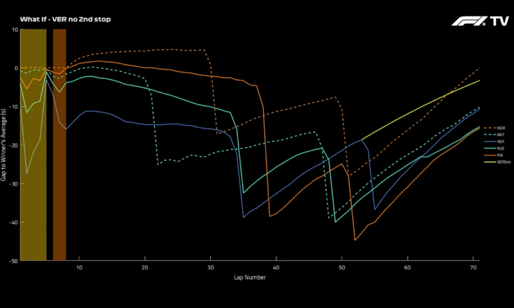 Verstappen by musel na jednej sade mediumiek vydržať 37 kôl a podľa tímu nemal šancu na víťazstvo. Je tu však aj opačný názor. Podľa simulácií Mercedesu, ktorého inžinieri sa bavili s reportérmi magazínu Auto Motor und Sport, bol Max v čase pred poslednou zastávkou v boxoch najväčším favoritom na víťazstvo. Podobný obraz ukazujú aj dáta F1 TV.