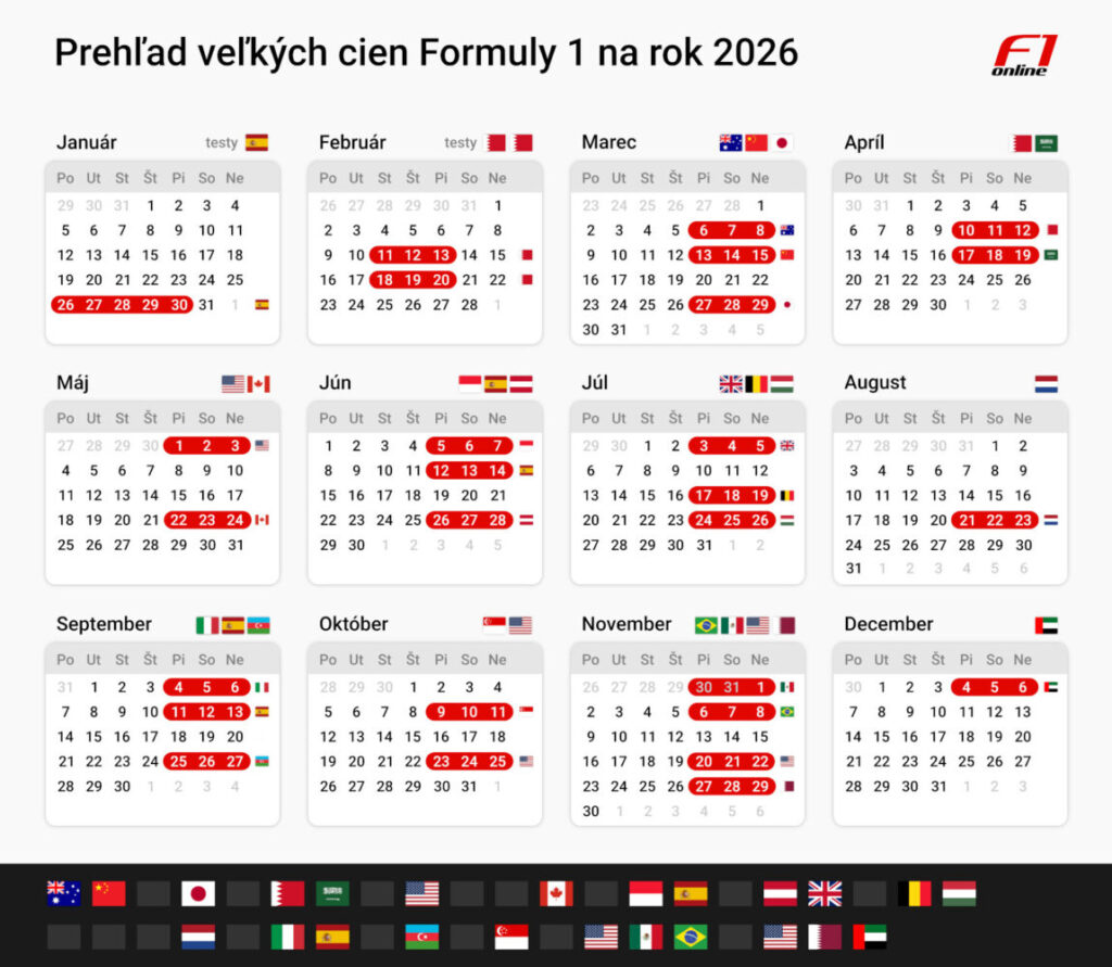 Prehľadový kalendár súťažných víkendov na rok 2026 v plnej veľkosti si môžete stiahnuť na nasledujúcom odkaze bit.ly/F1online-kalendar-2026
