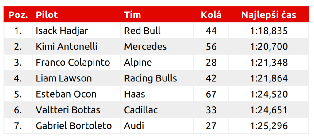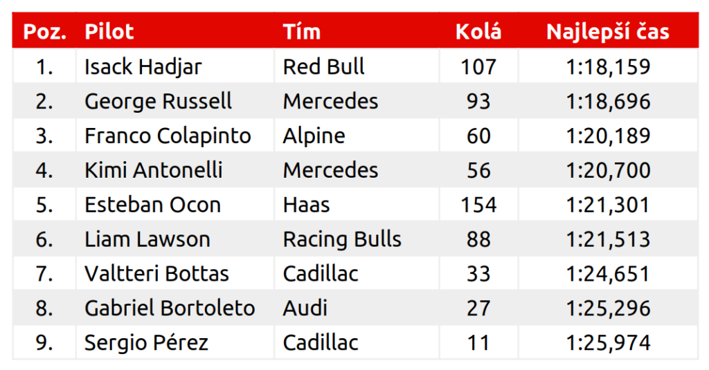 Najrýchlejší bol Isack Hadjar na Red Bulle RB22 s časom 1:18,835, ale oveľa dôležitejšia je v tejto chvíli štatistika počtu odjazdených kôl. Esteban Ocon ich zaznamenal najviac zo všetkých, keď barcelonský okruh obišiel 67-krát. Všetky tímy však stihli odjazdiť aspoň 20 kôl.