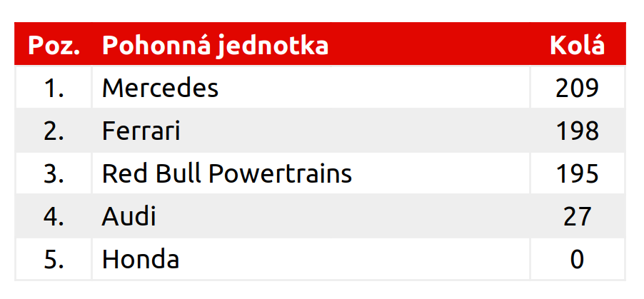 Spomedzi dodávateľov pohonných jednotiek nazbieral najviac dát Mercedes. Medzi ním, Ferrari a Red Bullom Powertrains to však bolo vzácne vyrovnané. Všetky tri značky sa ocitli na hranici 200 kôl.