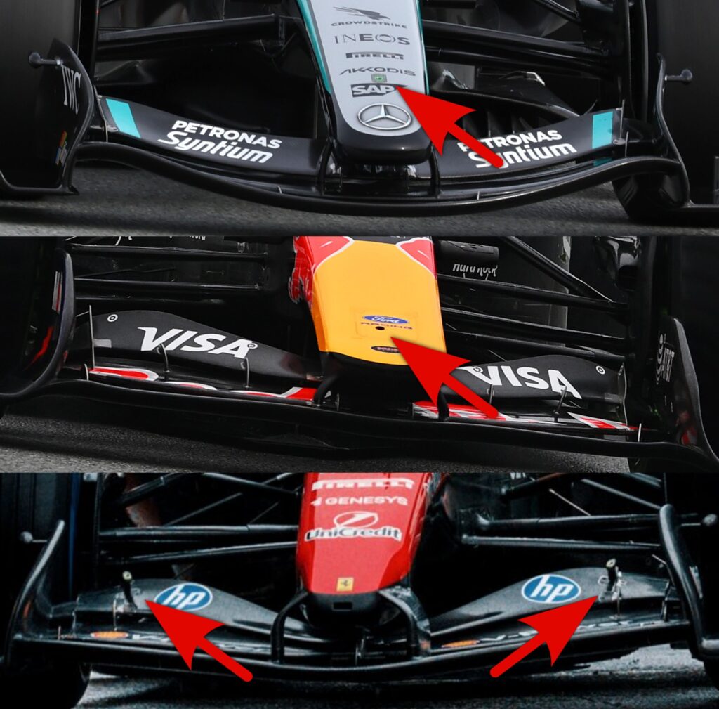Môžeme si všimnúť, že na veľkej väčšine predných krídel je nos spojený s prvým profilom predného krídla (žltá na obrázku nižšie), no Mercedes spája nos až s druhým profilom (zelená). To znamená, že na rozdiel od ostatných je na prednom krídle pohyblivý len tretí profil — ak sa pozrieme na riešenia konkurencie, v ich prípade sa hýbu dva profily.