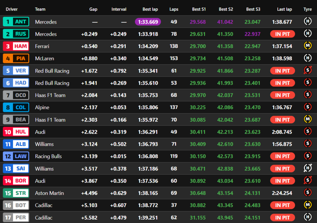 Mercedes bol nútený vynechať štvrtkové ráno pre výmenu pohonnej jednotky, ale piatok je v jeho podaní zatiaľ ukážkový. George Russell sa totiž podľa neoficiálnych informácií (vo štvrtok nefungoval live timing) stal po Norrisovi a Leclercovi tretím pilotom, ktorý absolvoval riadnu pretekovú simuláciu. V troch približne rovnako dlhých stintoch preveril mäkkú, stredne tvrdú aj tvrdú zmes.