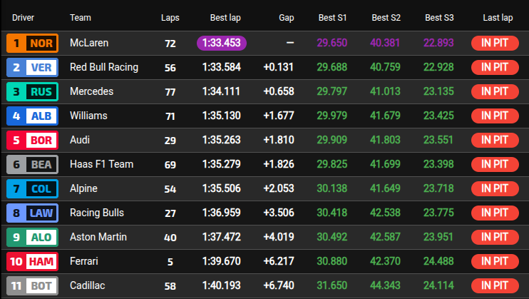 Popoludní sa na čele nakrátko usadil Max Verstappen, ale deň napokon patril Kimimu Antonellimu a Oscarovi Piastrimu. Pilot Mercedesu sa s časom 1:33.459 s dostal na menej ako tri sekundy za hodnotu času minuloročnej pole position. Piastri bol iba o 58 tisícin pomalší a tretí Verstappen stratil tri desatiny.