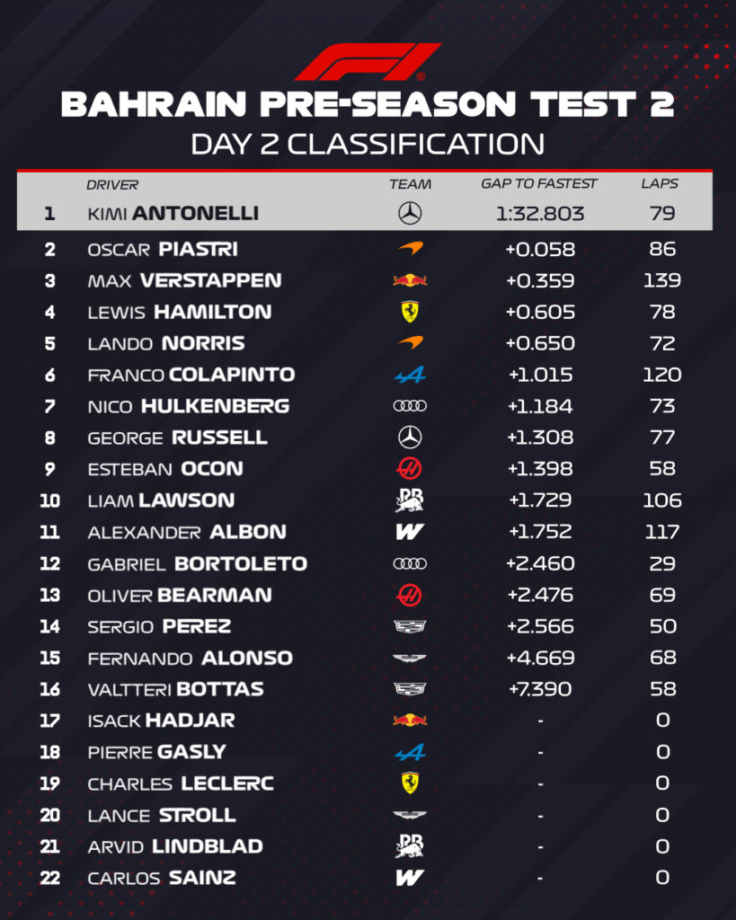 Bahrajnské testy pokračovali piatym dňom a tak trochu sa nám ako cez kopirák zopakovala streda. Na čele bol opäť Mercedes s McLarenom v závese, Ferrari sa opäť nevyhli technické problémy a pokračovala aj mizéria Aston Martinu.