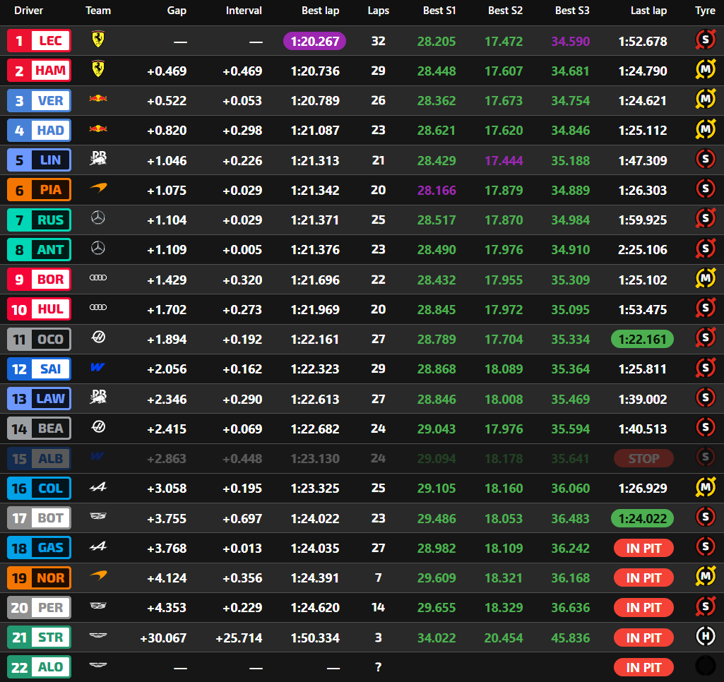 Na čele si to medzitým rozdávali nateraz bezchybné monoposty Ferrari a Red Bullu. Charles Leclerc sa na začiatku striedal vo vedení s Maxom Verstappenom a Isackom Hadjarom. V záverečnej dvadsaťminútovke vstúpil do debaty Lewis Hamilton, zajazdil najrýchlejší čas a na čele zostal až do poslednej minúty, keď to ešte raz skúsil Charles Leclerc a svojho tímového kolegu zdolal o takmer pol sekundy.