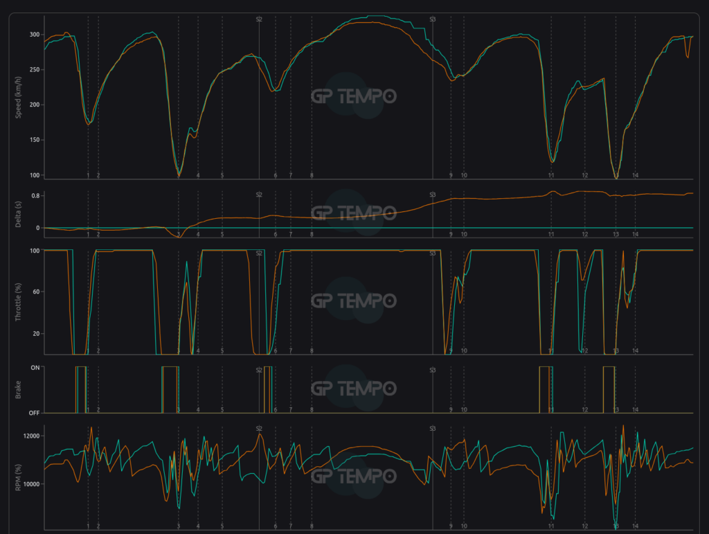 Telemetria (nižšie) ukazuje, že v nájazde do šiestej zákruty Piastri spomaľoval, pričom Russell šiel naplno o čosi dlhšie. Sedliacky rozum hovorí, že McLaren v tomto úseku získal vďaka šetreniu a rekuperácii viac energie, ktorú by mal mať k dispozícii na dlhej rovinatej pasáži pred deviatou zákrutou.