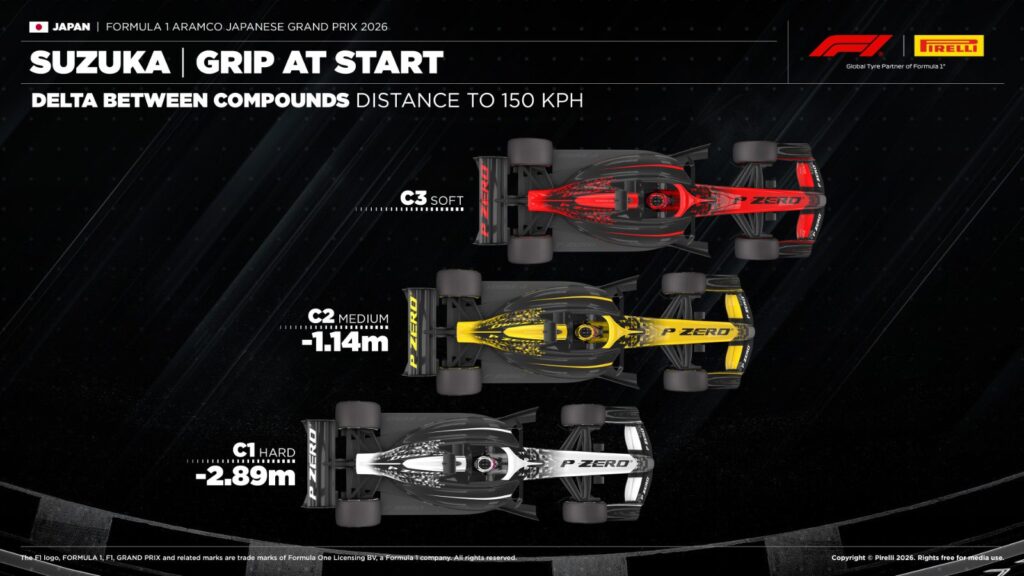 Samozrejme, aj v Japonsku sa oplatí štartovať na najmäkších pneumatikách, aspoň pokiaľ ide o prvé kolo pretekov. Mäkká zmes tu má však výhodu len 1,14 metra oproti mediumkám, resp. takmer 2,9 metra v porovnaní s tvrdou zmesou.