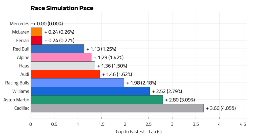 Papierovo by mal byť dnes najrýchlejší Mercedes s náskokom dvoch desatín pred McLarenom a Ferrari. Za týmito troma tímami nasleduje obrovská medzera. Red Bull sa totiž ocitol v strede poľa pred Alpinom, Haasom a Audi.