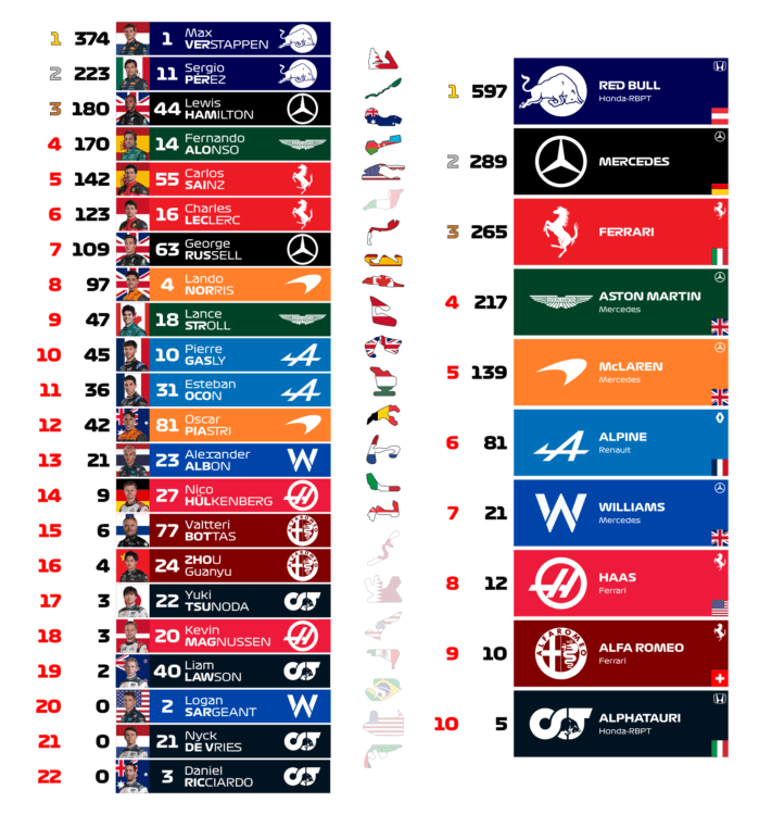 Pohľad na celkové poradie. Ferrari sa nebezpečne priblížilo k Mercedesu, na ktorý stráca už len 24 bodov. McLaren sa tiež blíži k Aston Martinu, ale tam je strata ešte pomerne vysoká (78 bodov).