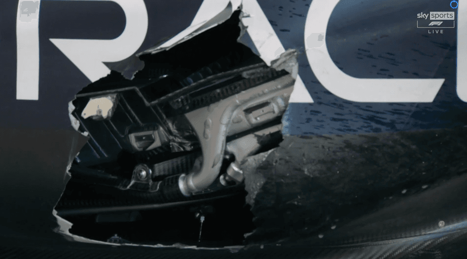 Takáto diera zostala v bočnici Sergia Péreza. Poškodená bola aj podlaha.
